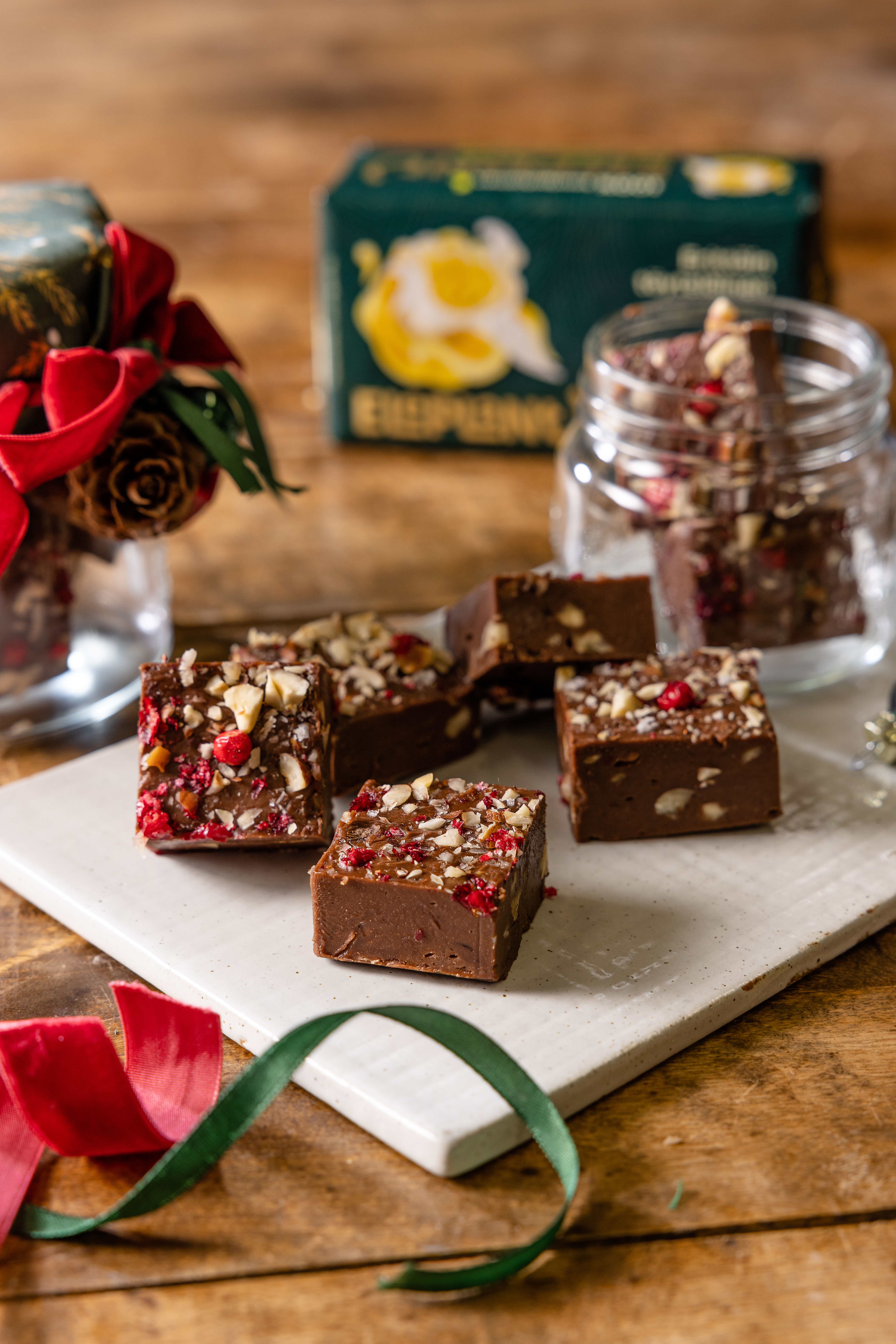 W rondelku podgrzej śmietankę, cukier i syrop glukozowy do temp. 116 stopni i zostaw do ostygnięcia na ok. 5 minut. Dodaj Eleplanta, cynamon, startą czekoladę i gałkę muszkatołową. Miksuj mieszankę przez ok 2-3 minuty, aż powstanie gładka i jednolita masa. Blaszkę do pieczenia wyłóż papierem (20×20 cm) i wlej do niej masę. Wyrównaj, a następnie posyp równomiernie solą himalajską, liofilizowanymi jagodami i orzechami. Włóż do lodówki na ok. godzinę, a gdy masa ostygnie, pokrój ją na małe kawałki.