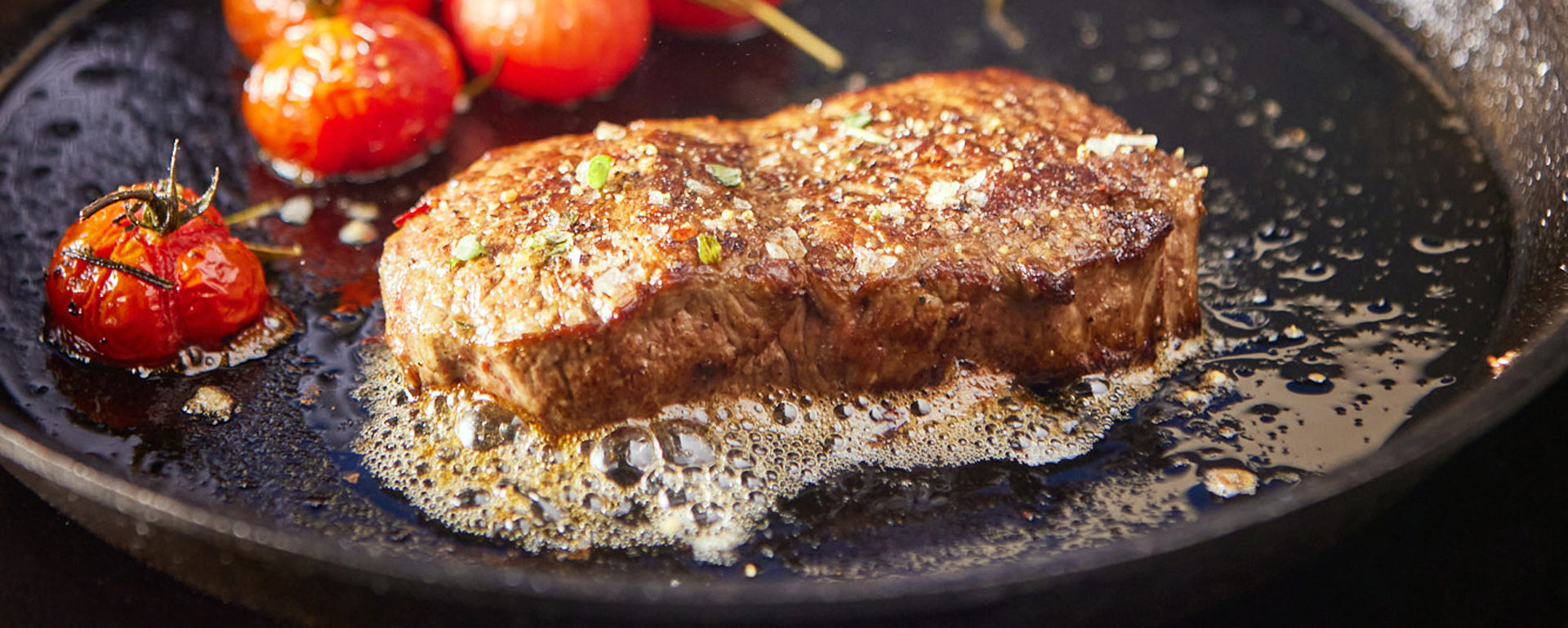 Pomidorki umyj i osusz. Doprowadź steki do temperatury pokojowej i dopraw solą, pieprzem i tymiankiem, tak jak lubisz. Rozgrzej dużą patelnię z głębokim dnem na mocnym ogniu, dodaj 1 łyżkę Eleplanta i rozpuść. Smaż steki przez około minutę, obróć na drugą stronę i smaż przez dwie minuty. Zdejmij z patelni i odłóż steki na deskę do krojenia, by odpoczęły.